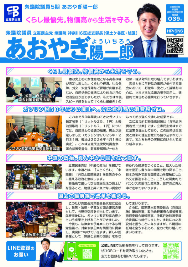 こんにちは、衆議院議員のあおやぎ陽一郎です(神奈川6区 横浜市保土ケ谷区旭区)。